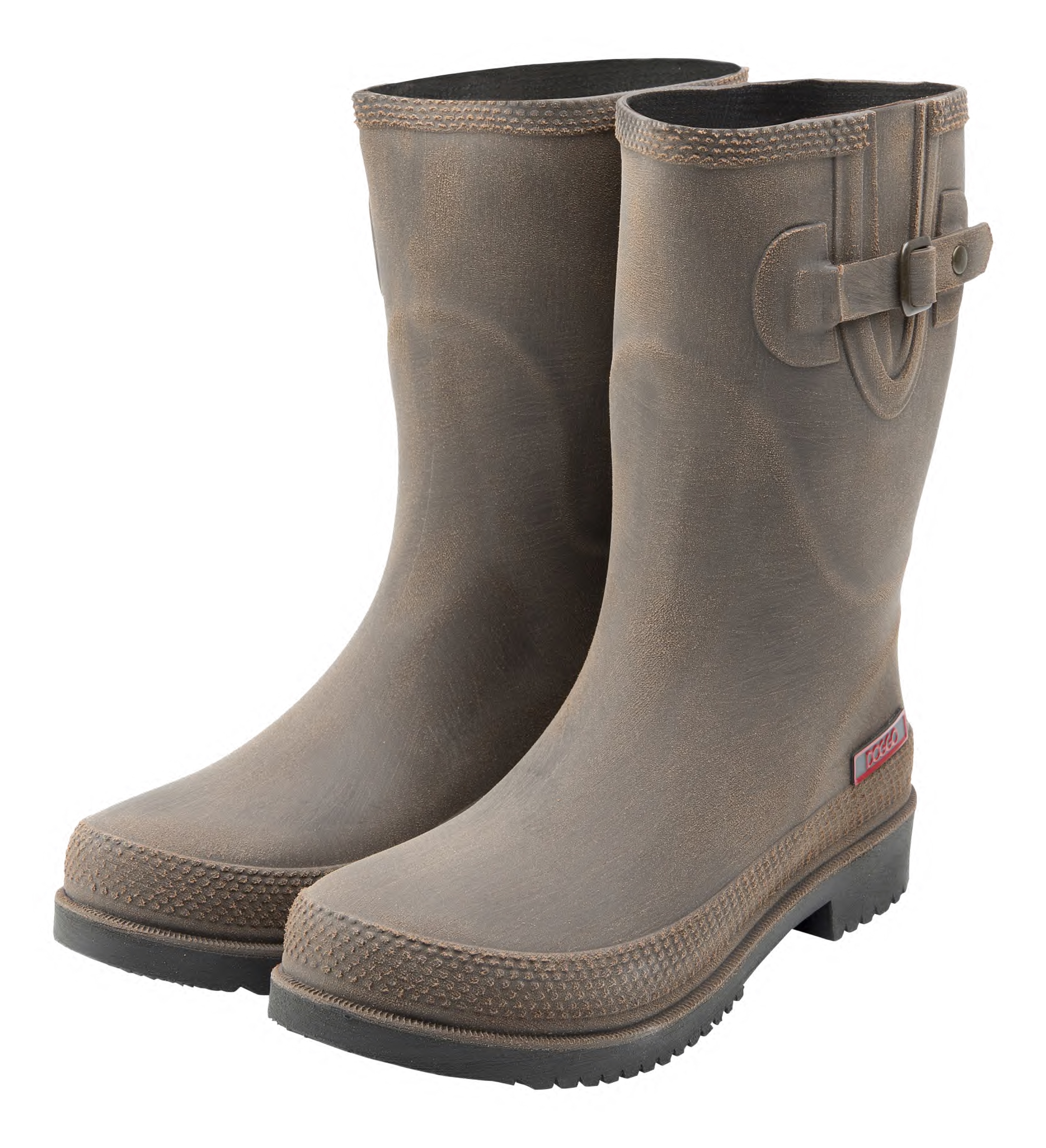 Durch die gebürstete Oberfläche wirkt der Gummistiefel eher wie ein sportlicher Lederstiefel. Die seitlich angebrachten schicken Zierschnallen macht den coolen Look perfekt.