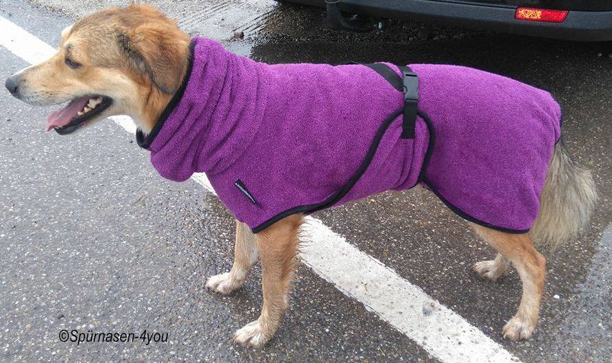 Das Dryup Cape wird über den Kopf Ihres Lieblings gezogen. Dann wird der Bauchlatz des Capes durch die beiden Vorderbeine geführt. Dadurch sind Brust- und Bauchbereich bereits bedeckt. Nun wird das Cape an den Seiten hochgeführt und am Rücken durch das Steckschloss fixiert.Die Weite kann hier nochmals durch die angebrachten Schieber individuell verstellt werden. Für die Rute ist hinten am Cape eine Öffnung eingenäht. So sitzt das Dryup Cape einfach perfekt. Nichts ziept oder rutscht. Ihr Hund kann nun schön durchgerubbelt werden und legt sich dann mit dem genialen Dryup Cape kuschelig eingepackt zum Schlafen. Es ist ganz egal welchen Schlafplatz er vorzieht. Die Umgebung bleibt Dank dem Dryup Cape immer sauber und trocken. Nach unserer Erfahrung fühlen sich Hunde mit dem Dryup Cape auch in der Wohnung sehr wohl und schwitzen nicht.