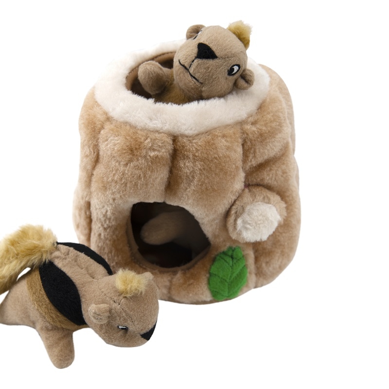 Nettes Hundespielzeug bestehend aus einem hohlen Baumstamm aus Plüsch mit 3 kleinen Plüsch Eichhörnchen.