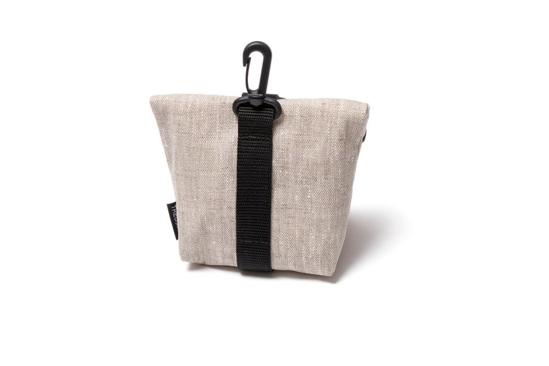 Großer Eingriff, extravaganter Verschluss. Die Leckerlitasche ist aus beschichtetem Leinen gefertigt.